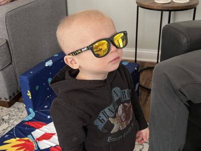 I purchased a pair of these sunglasses as part of a new baby gift; wanted something original that most others wouldn’t think of. They are so stinkin’ cute and they come with a little cord/strap to wrap around the little one’s head to help keep them on! Hoping to get a picture of them on my nephew but I don’t have one yet…